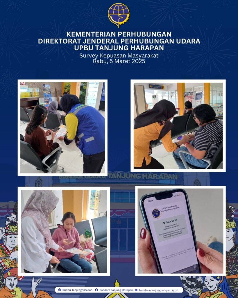 Kegiatan Survei Persepsi Anti Korupsi (SPAK) dan Survei Persepsi Kualitas Pelayanan (SPKP) di lingkungan Kementerian Perhubungan dilakukan secara real time melalui Aplikasi 3AS (Transparant, Informative, Great, Action, Actual and Synergy) Case Survey Management System (CSMS). Kegiatan survei ini dilaksanakan terhadap penerima pelayanan publik setiap bulannya di Bandar Udara Tanjung Harapan. Penerima layanan jasa transportasi udara Bandar Udara Tanjung Harapan tentu saja dapat memberikan respon dan tanggapannya terhadap pelayanan yang diterima melalui media sosial Instagram atau Web Bandar Udara Tanjung Harapan.
