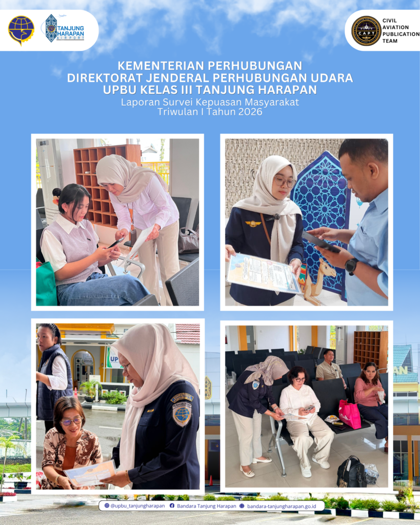 Kegiatan Survei Persepsi Anti Korupsi (SPAK) dan Survei Persepsi Kualitas Pelayanan (SPKP) di lingkungan Kementerian Perhubungan dilakukan secara real time melalui Aplikasi 3AS (Transparant, Informative, Great, Action, Actual and Synergy) Case Survey Management System (CSMS). Kegiatan survei ini dilaksanakan terhadap penerima pelayanan publik setiap bulannya di Bandar Udara Tanjung Harapan. Penerima layanan jasa transportasi udara Bandar Udara Tanjung Harapan tentu saja dapat memberikan respon dan tanggapannya terhadap pelayanan yang diterima melalui media sosial Instagram atau Web Bandar Udara Tanjung Harapan.